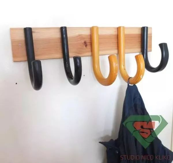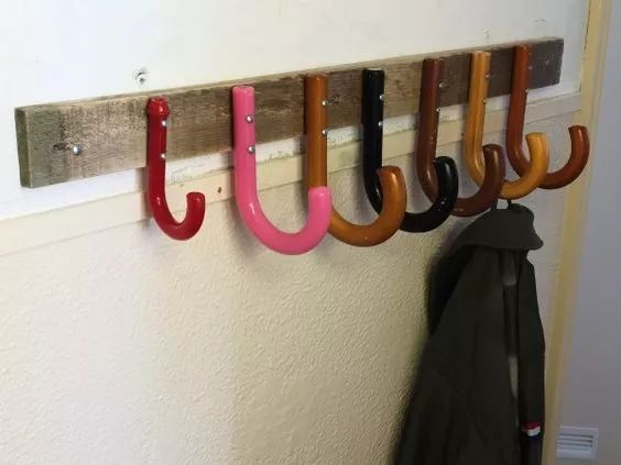 又或者用胶水粘在木板上。在门边固定一排伞柄挂钩,到家立刻把外套大衣和包包都收纳挂好,再也不怕乱。