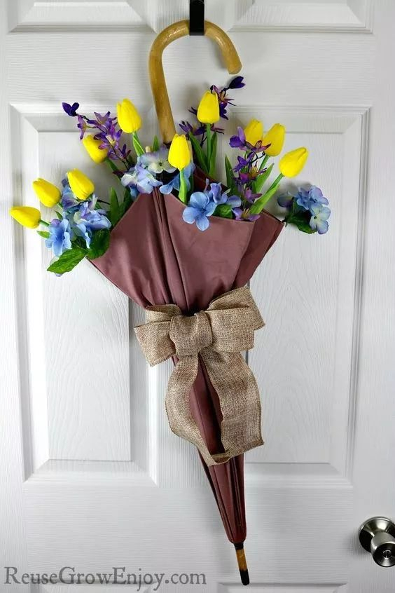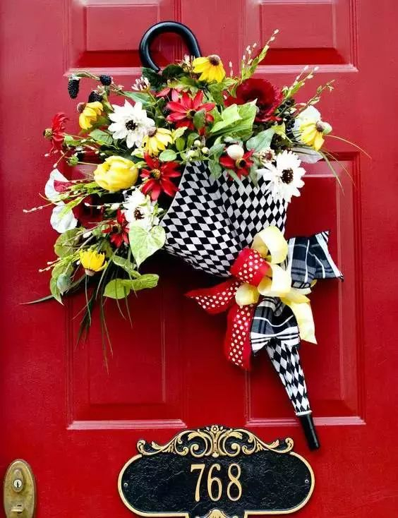 把花朵一根一根插进雨伞,然后找一根宽一点的丝带系上蝴蝶结,挂在门上墙上都特别好看。