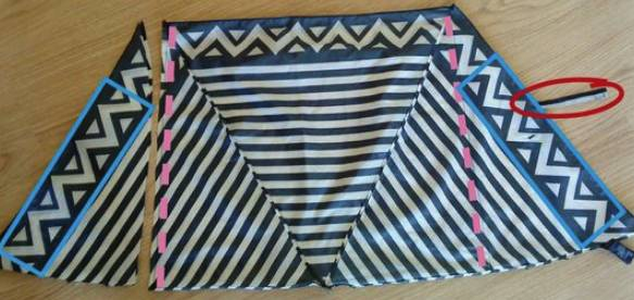 除了用线缝出一个环保袋,你也可以只剪个小洞,用根绳子就能串出一个手提大包!在距离每个伞角2公分的地方剪开一个小洞,可以穿过绳子的大小即可。