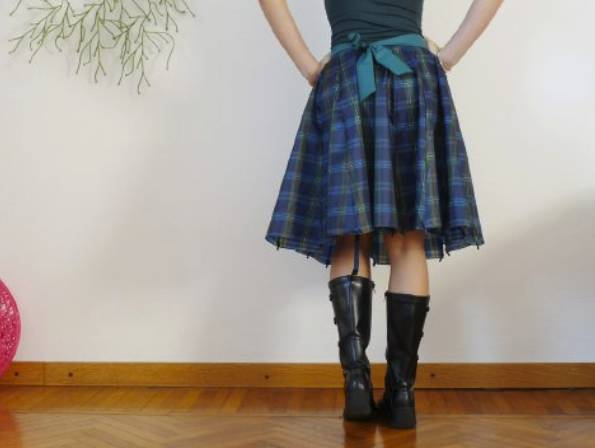 普普通通的深蓝格子伞,这样做一条裙子配上一个绿蝴蝶结腰带,有种英伦的风范,看起来还不错~