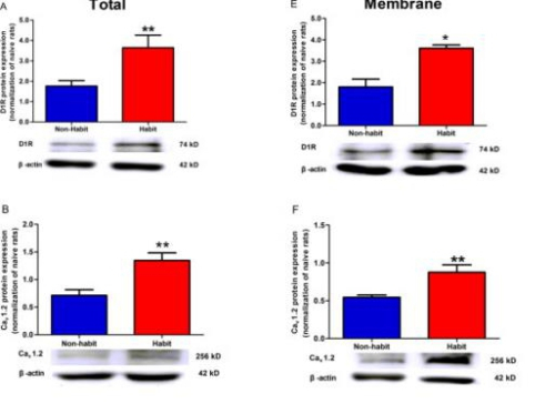 图2.习惯化组DLS脑区D1R及Cav1.2表达在总蛋白和膜蛋白水平都显著高于非习惯化组