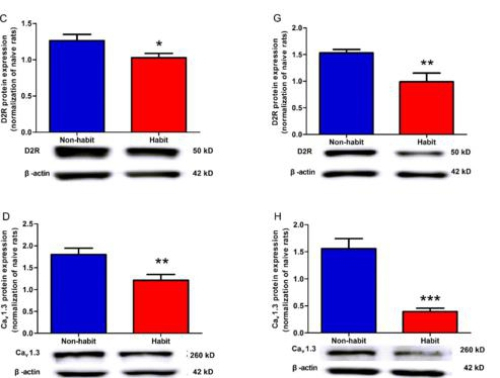 图3.习惯化组DMS脑区D2R及Cav1.3表达在总蛋白和膜蛋白水平显著低于非习惯化组