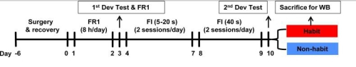 习惯性行为是指不依赖于结果直接由刺激(stimulate)诱发反应(response)的自动化行为。以往研究表明,背侧纹状体(Dorsal striatum, DS)的多巴胺(dopamine, DA)系统参与习惯性觅/用药过程,但功能差异明显的D1和D2类DA受体在这一过程中的调控机制尚不清楚。此外,L型钙离子通道(L-type calcium channels, LTCCs)可以调节神经元的活化,其关键亚型Cav1.2及Cav1.3能够直接与D1及D2受体形成信号通路参与学习记忆等行为。因此,阐明LTCCs-DA受体通路对可卡因习惯化觅/用药的调控作用将进一步揭示成瘾习惯化的神经生物学机制。