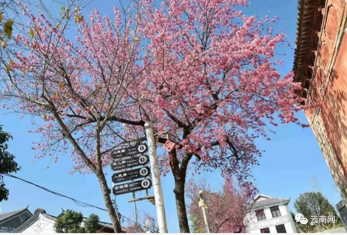 古城的冬樱,银杏和樱花交错。在古城博爱路上,路边的樱花仿佛给古老的建筑穿上了粉红的新衣。放眼望去,就像是为路人铺设的樱花大道。