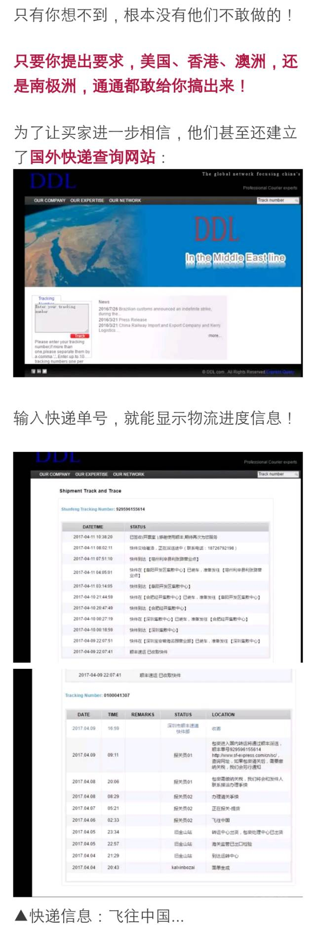 快递公司利用行业的便利,弄到境外物流网点的运单号,再用境外物流网点的代码登录物流的扫描设备,然后扫描这些运单。(国外的物流信息就这样伪造出来了!)