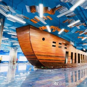 ▲四号线的南沙客运港站极具视觉冲击力。作为海上丝绸之路的起点,全站以“一带一路”为主线,全面融入海洋、宝船、海鸥等文化元素,重现了广州海上丝绸之路的历史盛景,全面实现整个车站的文化升级。