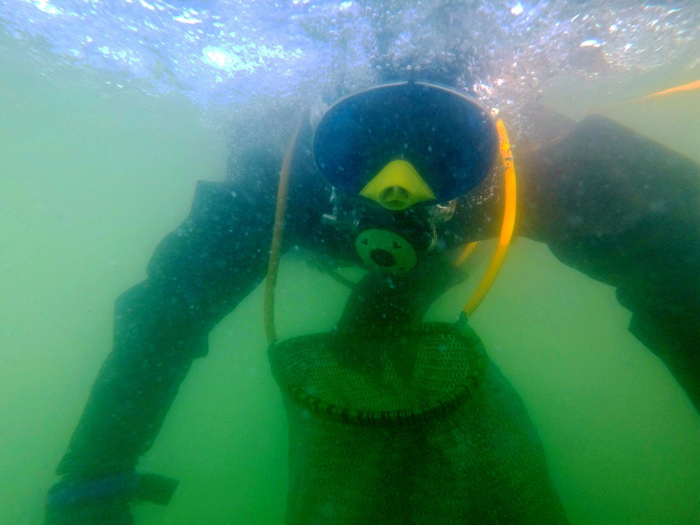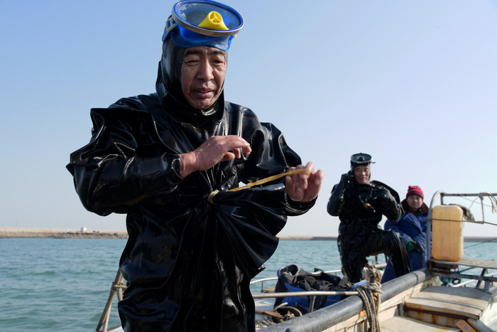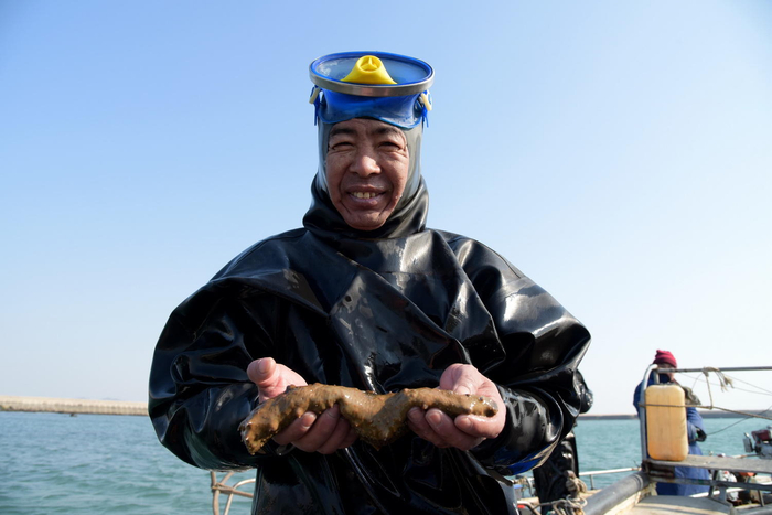为了解放双手,捞参人需要把装海参的网兜挂在脖颈上,潜入海底。