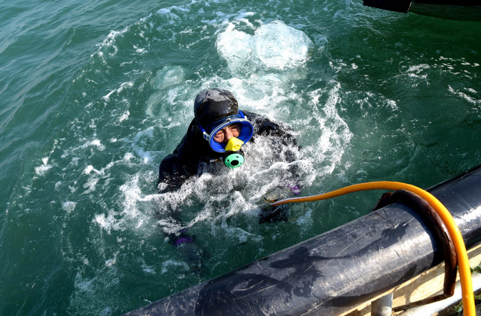 鸭岛附近海面微波荡漾,两艘小船停留在距离码头不远处。每条船上各自安装有两个柴油发动机,除了驱动螺旋桨,还有一个用来将空气压缩进醒目的黄色管道中,站在岸能听见聒噪声响。为捞参人和记者提供氧气的就是这条连接船上空气压缩机的黄色“生命线”。