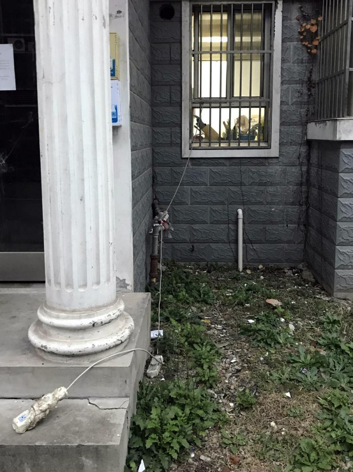 62号楼门幢口,二楼阳台垂下来的一根黑色延长线,插座被直接扔在了绿化带的草地上;