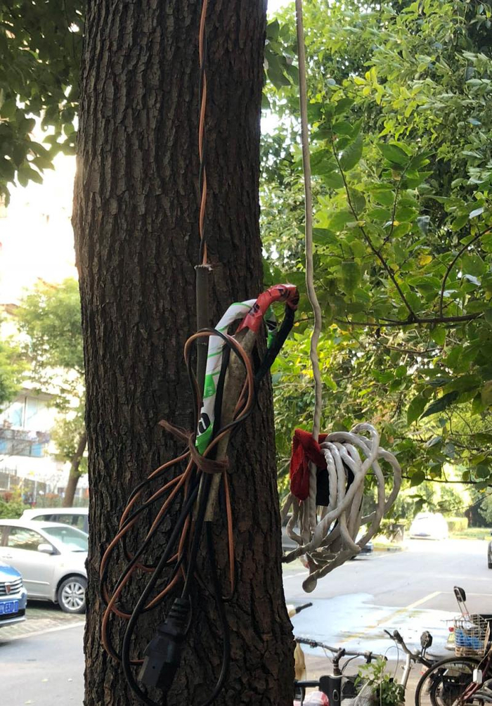 56号楼门口,一棵树上缠上了一堆电线,光插座就有2只,且都暴露在外,毫无遮盖……