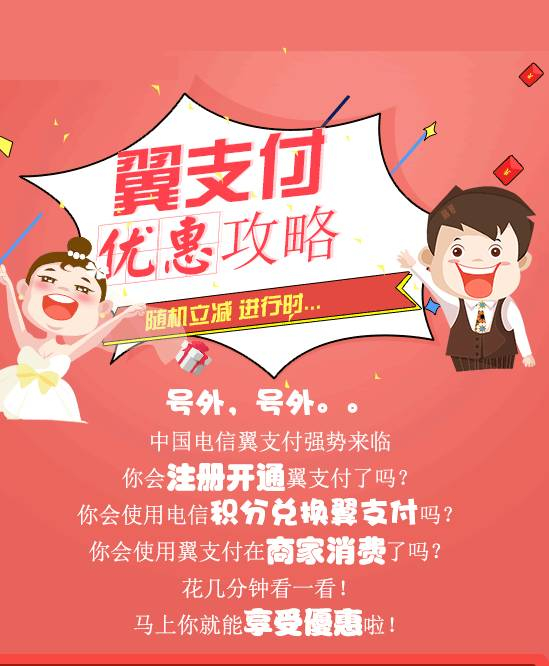 2.随机立减活动:南宁移动和联通翼支付二星及以上实名用户刷翼支付消费享受随机立减,每个用户累计最高优惠5元。