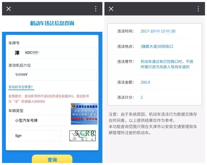 登录“天津市公安交通管理局交通安全综合服务管理平台(以下简称‘互联网服务平台’http://tj.122.gov.cn)”、“天津公安民生服务平台(http://www.tjgaj.gov.cn)”查询。