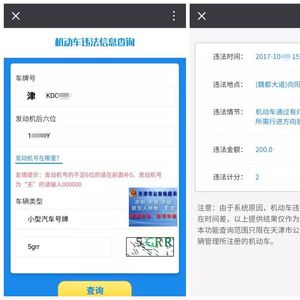 手机微信,关注“天津交警”微信公众号后,点击该公众号主页左下方的“信息查询”,再选择点击“机动车违法信息查询”或“驾驶人违法信息查询”,其中查询机动车违法信息需输入机动车号牌和发动机尾号后6位,查询驾驶人违法信息则需输入驾驶人姓名、身份证等证件号码、驾驶证档案编号。
