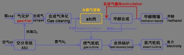 煤基多联产是指利用从单一的设备(气化炉)中产生的"合成气"(主要成分为CO+H2),来进行跨行业、跨部门的生产,以得到多种具有高附加值的化工产品、液体燃料(甲醇、F-T合成燃料、二甲醇、城市煤气、氢气)、以及用于工艺过程的热和进行发电等。