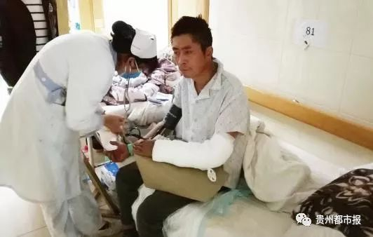 昨日,记者在贵阳市第四人民医院见到了伤者冯永明,他坐在病床上,左胳膊包着纱布,护士正在为他测量血压。