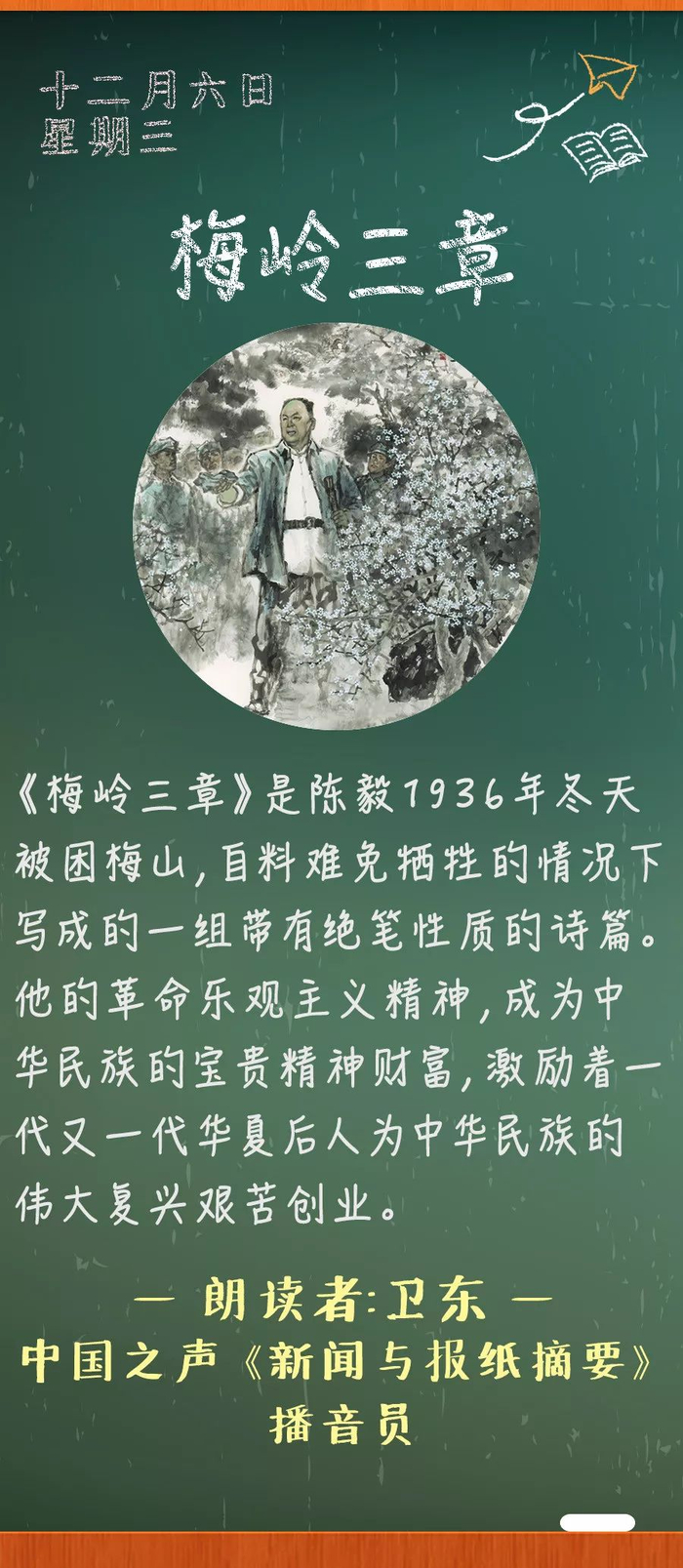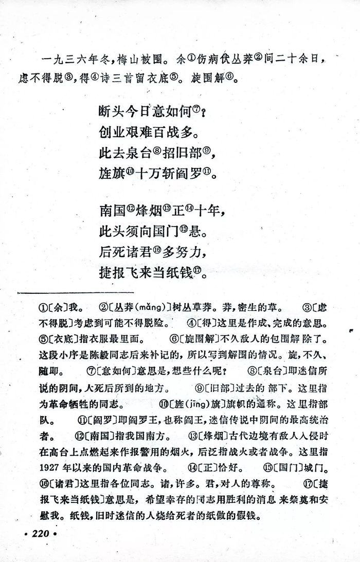 《梅岭三章》作于1936年冬。中央红军于1934年10月离开苏区进行长征,陈毅因重伤未愈,被留下坚持斗争。他领导红军和游击队从中央苏区突围,在赣粤边界的梅岭地区坚持游击战争。陈毅率部风餐露宿,昼伏夜行,整整两年,经历了极其残酷的斗争考验。敌人听说山上有游击队的重要负责人,便调集了四个营的兵力,将梅山团团围了20多天。陈毅以伤病之身伏丛莽间,幸得脱险。《梅岭三章》便是陈毅同志被困梅山,自料难免牺牲的情况下写成的一组带有绝笔性质的诗篇。作为军人,他以自己的行动有力地证明了共产党领导的红军是一支不可战胜的革命力量;作为诗人,他给人们留下了《梅岭三章》等气壮山河的诗篇。