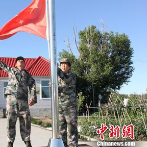 图为一八五团职工马军武和妻子张正美每天坚持升国旗。(资料图) 杨东东 摄