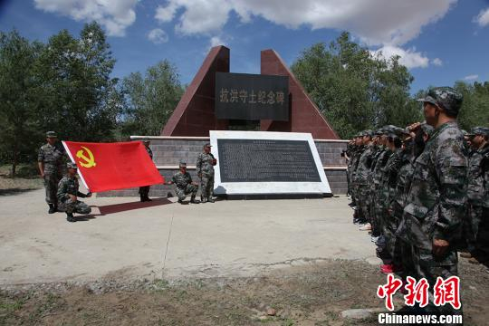 图为一八五团在沈桂寿升国旗旧址举行升国旗仪式。上世纪七八十年代,在一八五天一连务农的沈桂寿看到前苏联边防哨卡每天升国旗后,心里萌生“我也要升中国国旗”的念头。于是,他与老伴用家中的红被面绣了一面国旗,用桦树作旗杆,用尼龙绳在当地升起了西北边境第一连的第一面五星红旗。(资料图) 杨东东 摄