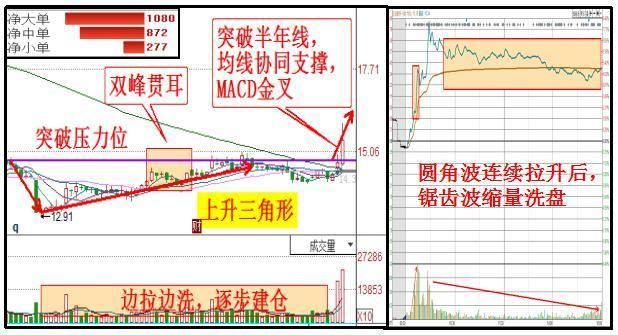 技术分析,该股超跌反弹,连续下跌后探底回升,股价形成上升三角形上涨趋势,底部放巨量之后堆量波浪型拉升,主力建仓,期间形成双峰贯耳走势,多头强势。目前突破120日均线和前期压力位,奠定上涨格局。MACD金叉偏多,均线协同支撑,短期延续上涨概率大。开盘后就出现圆角波连续拉升,而后进行锯齿波缩量洗盘,围绕均线震荡,主力借机洗去浮筹,全天边拉边洗。全天大中小单配合拉升,市场合力看好,资金净流入2230万。主升浪将开启!只要是撑握了这种选股方式的朋友,抓牛股,都是一抓一大把,很多之前亏损的朋友,学会此法之后,都是扭亏为盈,当然,如果你愿意学,本人也愿意倾囊相授!