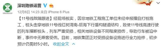 深圳地铁称,12月6日7时许,外部施工单位正业建设有限公司在为业主方深圳市昂塞特体育用品有限公司进行项目“昂赛特攀岩基地”作业时,在未经审批的情况下擅自进行打桩施工作业,桩头击穿地铁11号线红树湾南-后海下行盾构隧道结构,致使11号线高速行驶的列车撞断桩头,列车严重受损,相关地铁设备不同程度损伤,导致行车被迫中断。