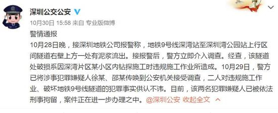 经警方调查,该隧道处破损系因深湾片区某小区内钻探施工时违规施工作业所造成。10月29日,警方已将涉事犯罪嫌疑人徐某、邵某传唤到公安机关接受调查,二人对违规施工作业、破坏地铁9号线隧道的犯罪事实供认不讳。
