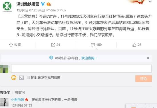 12月6号一大早,深圳地铁11号线在前海湾站突然“停车”,所有乘客被要求下车的事情在朋友圈和微博刷屏,11号线故障因此上了热搜。亲身经历的网友发微博称:7点多出门,10点才到公司,11号线停运,地铁停靠的终点在工地上,出站也打不到车,换乘1号线拥挤得到不了站台,怀疑人生。