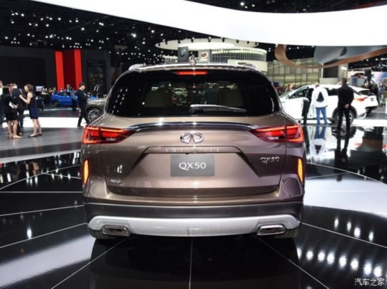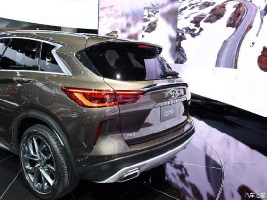 车尾部分,QX50整体线条简洁有力,尾灯造型也十分具有科技感。整体保留了概念车的设计元素,尾门两侧翼子板上的开口设计与车头呼应,非常动感。而后保险杠下方在同样配备有银色的下护板,与之搭配的则是双边共两出布局的扁口式镀铬排气。