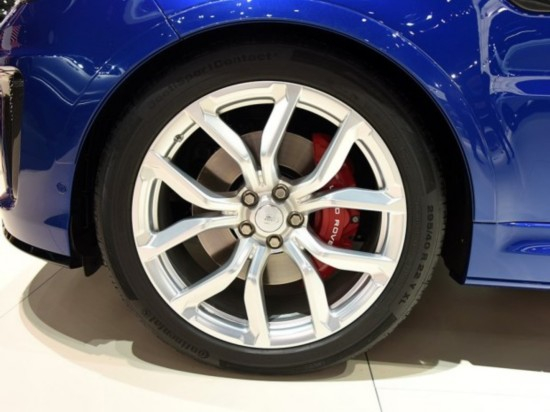 与此同时,新款SVR车型还配备了全碳纤维的双色发动机舱盖,其上配有两个大尺寸散热口,看起来杀气十足,更显凶悍。此外,新车还配备一套22英寸的双五辐轮圈,搭配295/40 R22规格的轮胎,内部大尺寸高性能刹车卡钳采用红色涂装,尽显性能车风范。