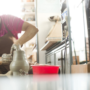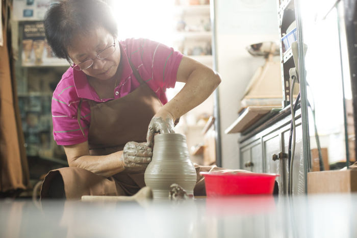 黄美莉的工作室藏在闹市之中,虽然每周开窑教课,但是工作室依旧非常整洁,连身上的围裙都洗的干干净净。