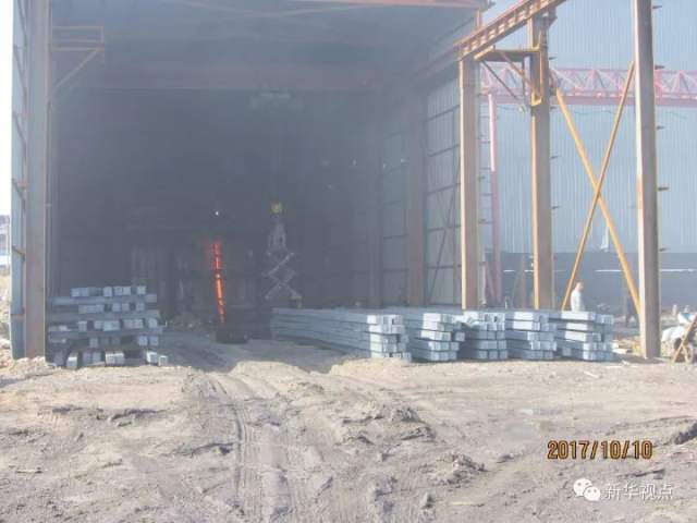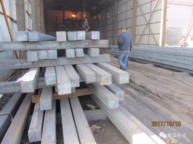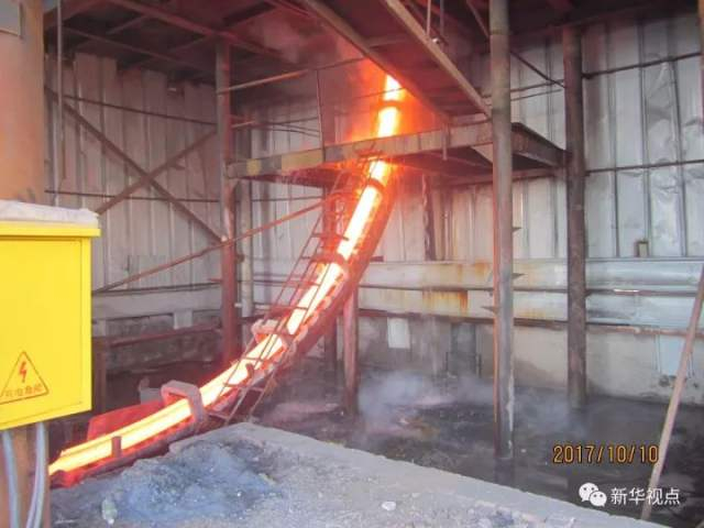 ↑2017年10月10日,位于黑龙江省七台河市一废弃焦化企业院内的“地条钢”黑加工点,从连铸机生产出来的钢胚。新华社记者 管建涛通联照片