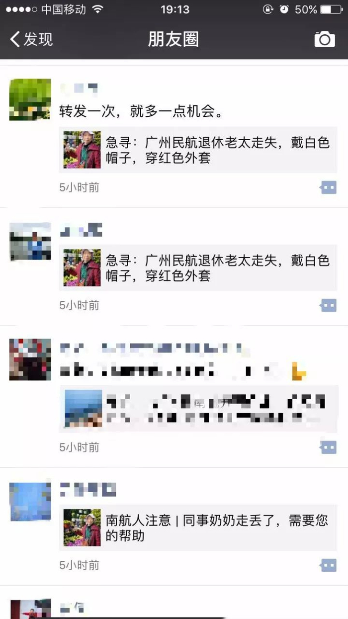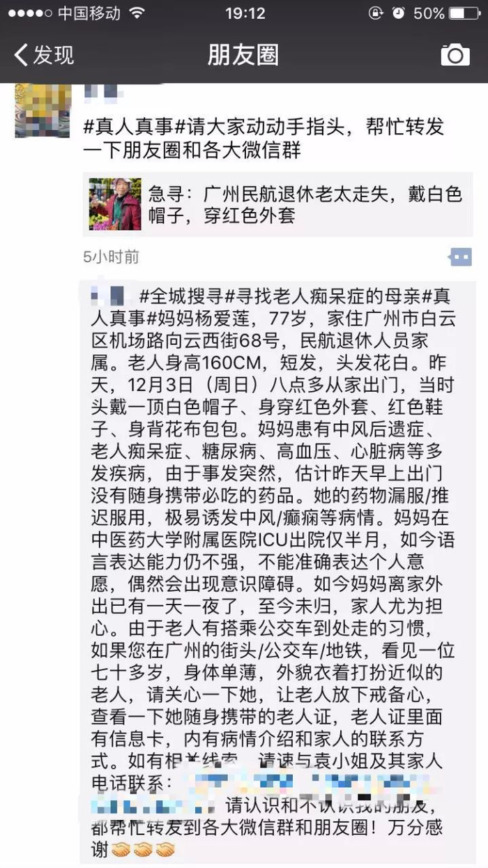 老人走丢 朋友圈寻亲信息转发量过万人次
