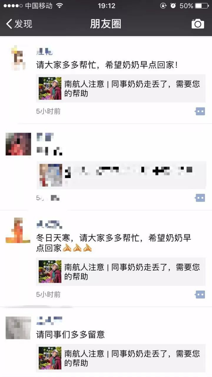 南航一位员工的奶奶在12月3日早上走丢了,经过朋友圈的爱心相助扩散寻亲信息,在好心人帮助之下,奶奶终于在12月4日晚上回到了家人身边。