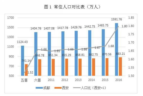 首先从城市人口容量分析,2016年末成都常住人口为1591.76万人,为西安(883.21万人)的1.8倍。2017年西安市托管西咸新区后,2016年末常住人口基数确定为945.21万人,两市人口比为1.68(西安=1)。而在人口增速方面,2011-2015年,成都常住人口年均增长0.85%,高于西安(0.54%)0.31个百分点,成都年均增长人口12.20万人,为西安的(4.63万人)2.63倍。