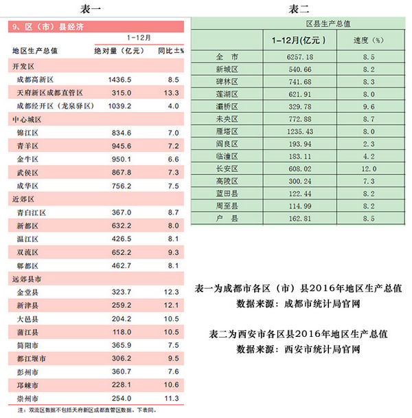 从行政区划与县域经济来分析,成都市辖11个市辖区、4个县,代管5个县级市,而西安市辖11个市辖区,2个县。成都的代管区域远大于西安,而且县级市通常拥有更高的经济主权,所以县域经济为成都争取到了大量的经济加分。在成都的管辖区域里,成都高新区为GDP贡献值最大,2016年成都高新区的GDP破千亿,达到了惊人的1436.5亿元,在全国所有高新区第3名,仅次于北京的中关村和上海张江。那能不能说成都的“高点”比西安要高呢?并不见得,2016年西安的雁塔区贡献GDP为1235.43亿元,基本与成都高新区打个平手。
