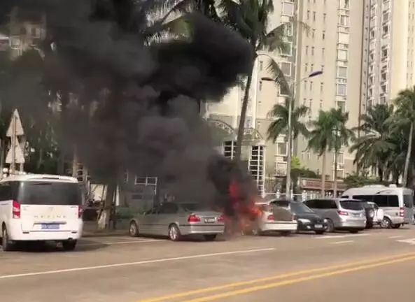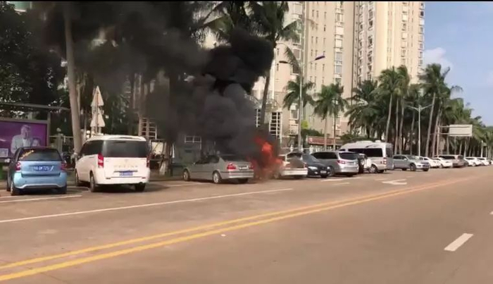 海口紫荆花园小区门口一辆轿车发生起火,