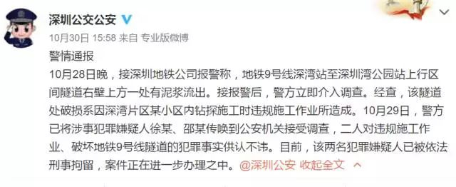 2017年10月28日21时许,地铁9号线深湾至深圳湾公园区间,因欢乐海岸蓝楹湾别墅区内有人违规钻探施工,造成距离地面13米深的隧道被击穿导致涌泥。所幸司机发现及时,这才避免了隧道进一步损伤和高速行驶的列车发生事故。深圳公交公安依法对犯罪嫌疑人徐某、邵某刑事拘留。