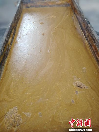 古法红糖熬制工艺非常复杂,需将当天收割的甘蔗经过切碎碾压,压出来的汁液去除泥土、细菌、纤维等杂质,在连环锅熬煮,经过榨汁、开泡、赶水、过滤、摇瓢、打沙、成型等过程。图为已经成型的红糖。 苏路程 摄