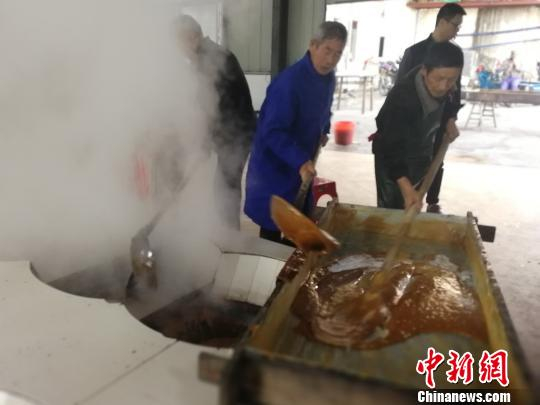 图为作坊里的工人搅拌已经熬制好的糖浆,赶走糖浆里多余的水分。 苏路程 摄