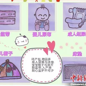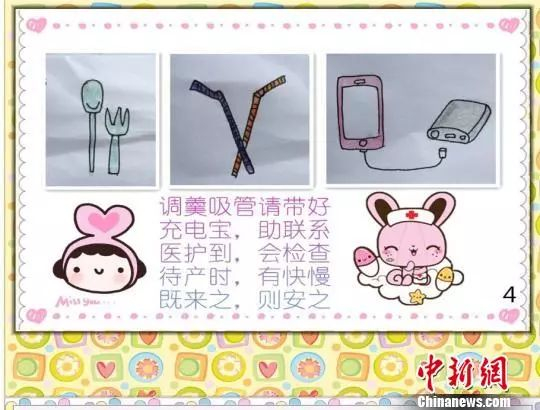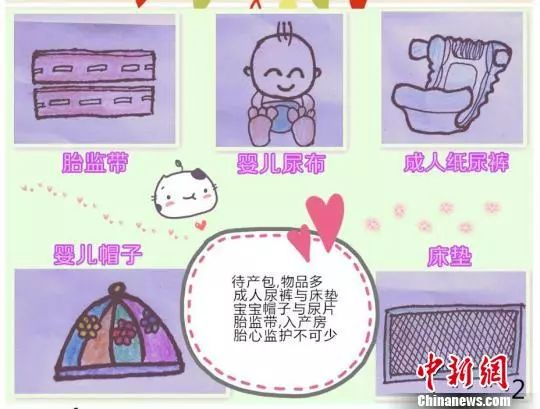 记者看到,萌萌的婴儿帽、可爱的宝宝穿戴着尿布、长方形的床垫、卡通状的成人纸尿裤、两条胎监带——这是《物品准备》篇的一页漫画,旁边编配文字:“待产包,物品多;成人尿裤与尿垫,宝宝帽子与尿片;胎监带,入产房;胎心监护不可少”,朗朗上口的小提示告诉产妇和家属待产的一些必备物品。
