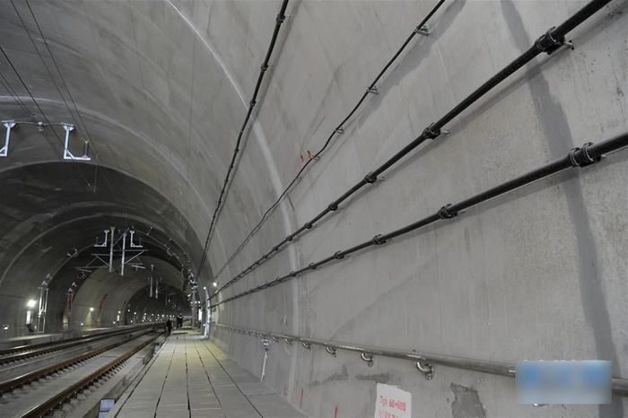 ▲清凉山隧道内用于释放无线信号的漏泄同轴电缆分别悬挂于轨面上方2.1米和2.6米处,与车窗上下沿对齐,用以使列车内网络信号更为稳定。西成高铁是全国首条4G信号设备全覆盖的山区高铁。