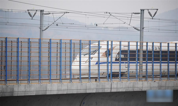 ▲11月27日,一列动车组试验列车通过装有朱鹮防护网的西成高铁赵家岭特大桥。