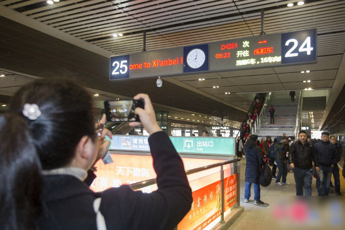▲12月6日,西安北站乘车指示牌显示,首趟西成高铁动车组列车——西安北至成都东D4251次将从这里发车。)