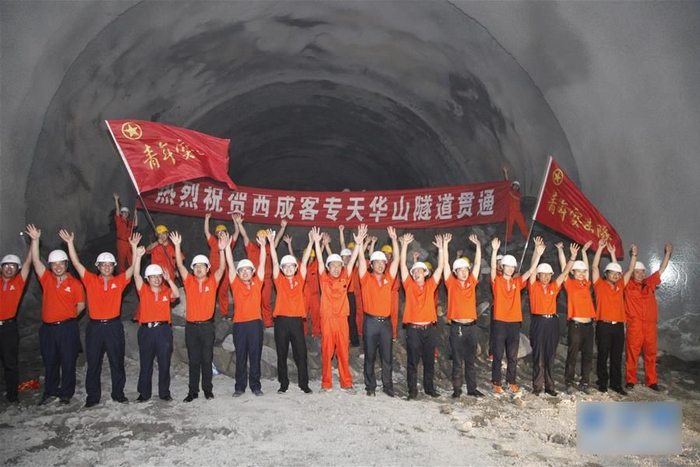 ▲西成高铁天华山隧道施工人员庆祝隧道贯通。