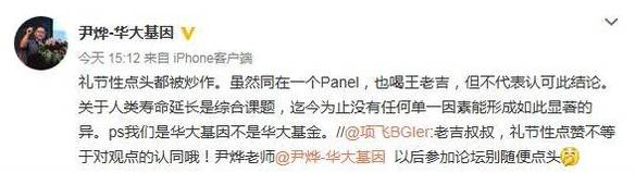 涉事的华大基因首席执行官尹烨在12月6日通过微博澄清道“只是礼节性点头并不代表认可此结论。关于人类寿命延长是综合课题,迄今为止没有任何单一因素能形成如此显著的异。”