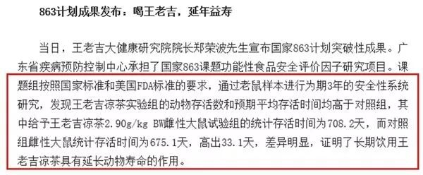 2016年1月7日,广药集团在“王老吉凉茶国家863计划突破性科研成果发布暨广州王老吉大健康研究院成立发布会”上,又一次正式公布,课题组参照美国FDA标准的要求,完成国内首个凉茶产品3年安全性系统研究,取得重大突破性成果:长期饮用王老吉凉茶可延长动物寿命。