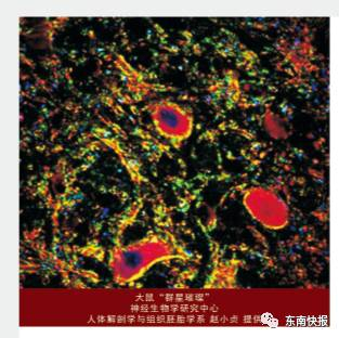 (5)“大鼠脑区神经元和神经胶质细胞分别用不同荧光抗体染色的结果——共聚焦显微镜”。人体解剖学与组织胚胎学赵小贞教授给这幅图取名为“群星璀璨”。