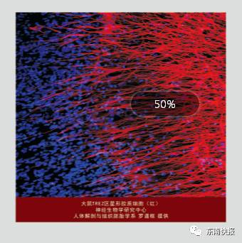 这张图也是在大鼠三叉神经根,分别用GFAP和IBA1两周抗体染色的结果,在不同波长的激光激发后显示的图片。细长红色的结构是星形胶质细胞的长突起,绿色的结构为小胶质细胞,蓝色的结构为胶质细胞的细胞核。(图片就像洋流或海底的鱼群,非常漂亮——随便想象,供参考)
