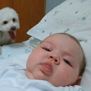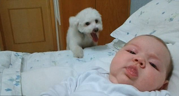 可爱!比雄犬尝试跳上婴儿床观察宝宝