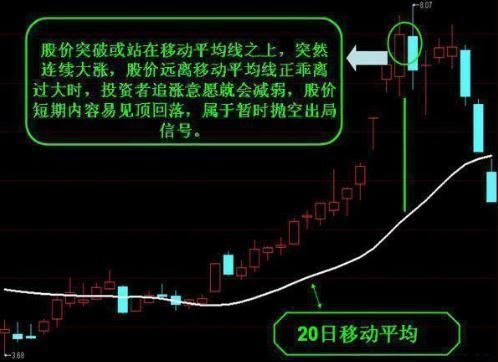 1、股价突破或站在移动平均线之上,突然连续大涨,股价远离移动平均线正乖离过大时,投资者追涨意愿就会下降,股价有可能短期见顶回落,属于卖出信号。