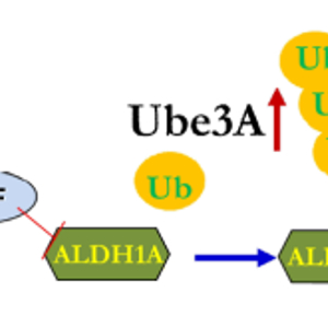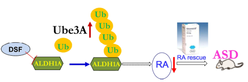 UBE3A(又名E6AP,因结合人乳头瘤病毒HPV编码的E6蛋白而得名) 是泛素研究领域最早被鉴定的泛素连接酶之一,根据其结构特征,定义一个涵盖大约40种蛋白的泛素连接酶HECT亚家族。从鉴定泛素连接酶UBE3A的酶学底物出发,研究首次发现UBE3A通过泛素化修饰视黄醛脱氢酶家族蛋白(维生素A代谢途径中,视黄醛转化成为视黄酸最重要的酶类)并抑制其视黄酸合成的催化活性。生化和电生理数据表明, UBE3A过表达导致神经元细胞中维甲酸水平的过度降低,以及破坏神经突触可塑性,并可能由此参与了自闭症的发生。在UBE3A过表达的小鼠自闭症模型中的实验表明,口服安全剂量的全反式维甲酸被发现能够显著缓解自闭症模型小鼠的一系列类似自闭症特征的行为,这为针对某些自闭症亚型的临床干预提供了非常有潜力的分子靶标和前期研究基础。